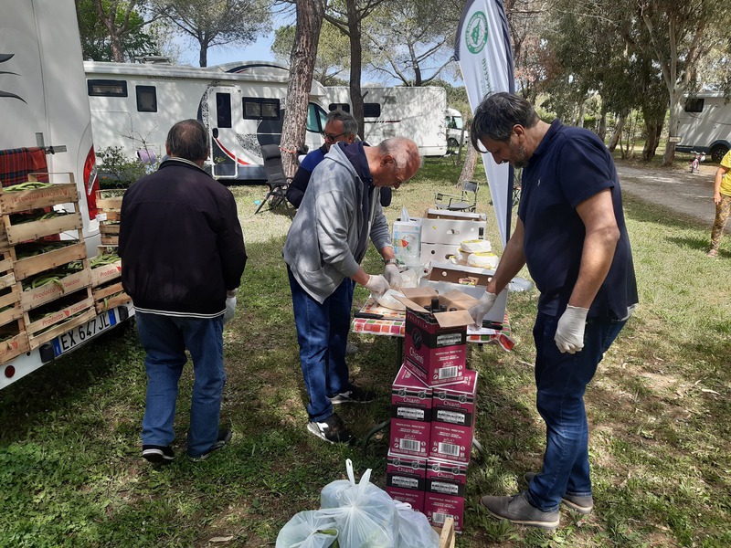 Raduno della "baccellata" al campeggio Free Beach, a Marina di Bibbona. Grande tavolata per un pranzo a base di pecorino e baccelli accompagnati da un buon bicchiere di vino e gara di pesca ai laghi "Le Palme".